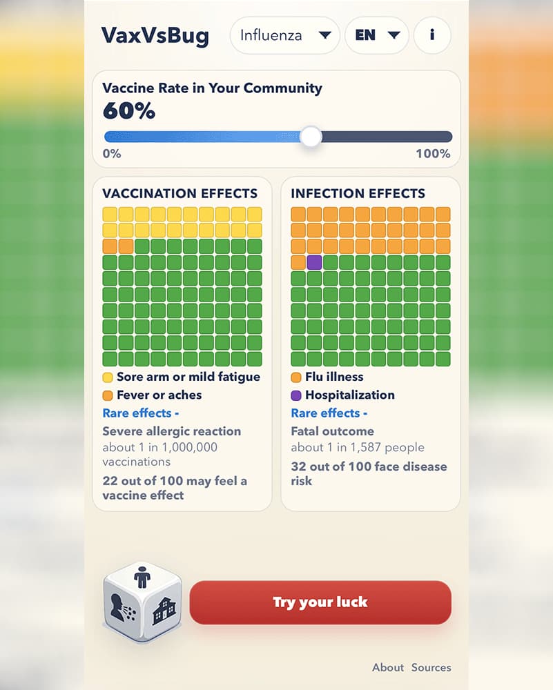 Olen julkaissut sovelluksen VaxVsBug, joka on vuorovaikutteinen verkkosovellus rokotehaittojen, tartuntatautien seurausten ja yhteisön rokotusasteen vaikutuksen tarkasteluun.